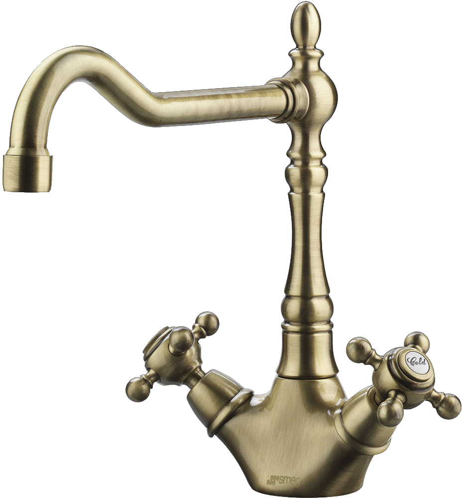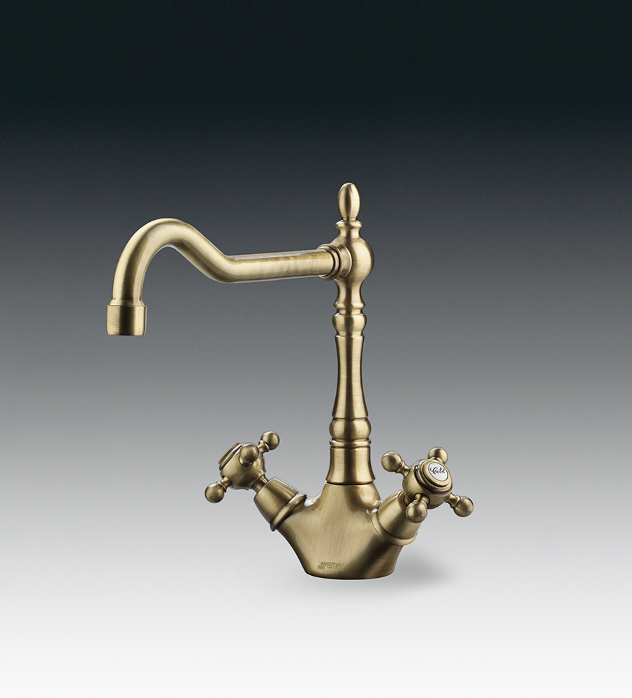 Этот великолепный смеситель имеет сразу несколько отличительных признаков. Во-первых, его точеный декоративный корпус имеет PVD покрытие цвета латуни. Теплый оттенок придаст кухне особенный уют. Модель выполнена в стиле ретро, так что сможет вписаться в любые интерьеры, стилизованные под старину. Для этого смесителя лучше подойдут мойки из искусственного камня либо модели с покрытием того же оттенка.