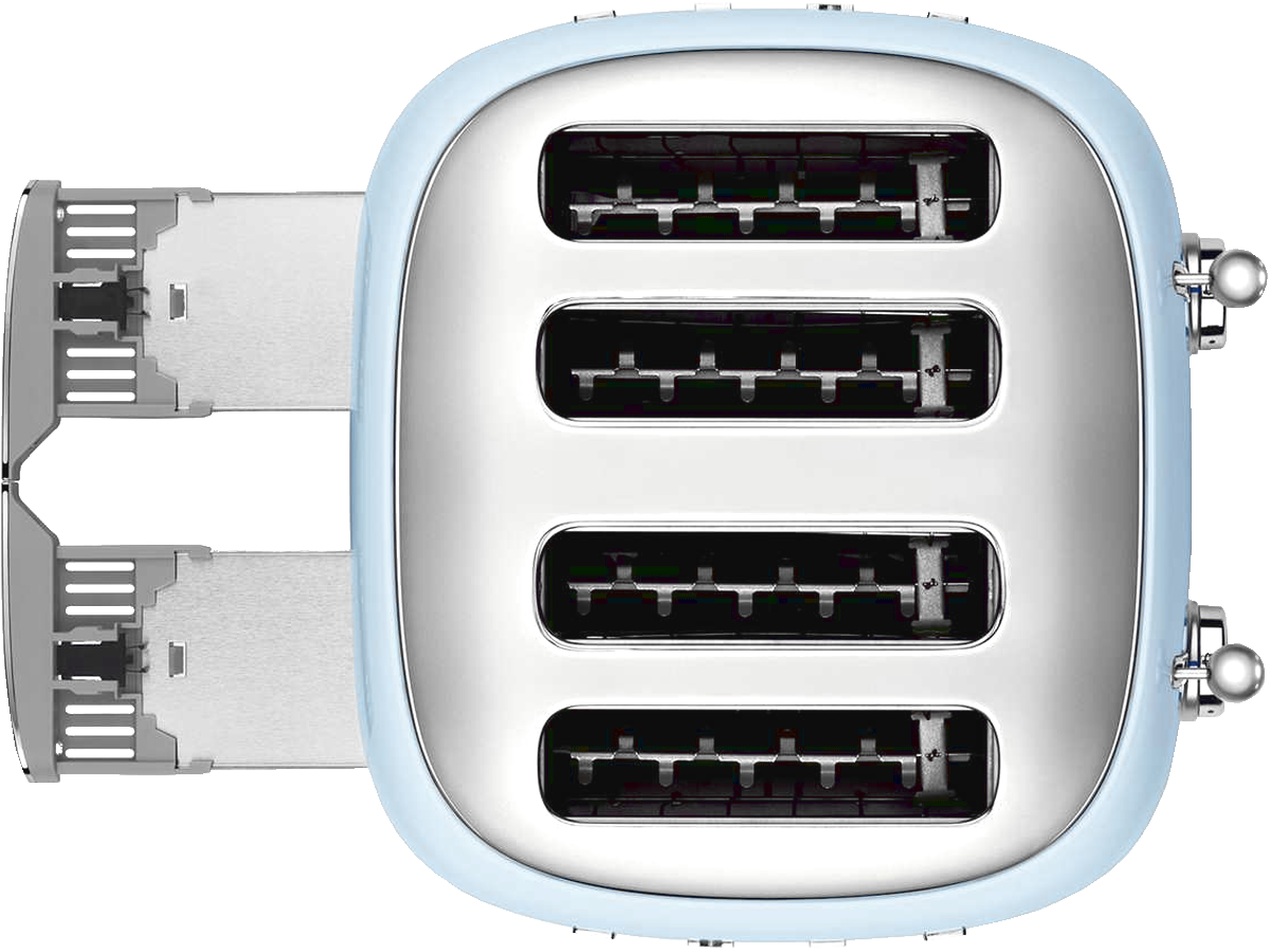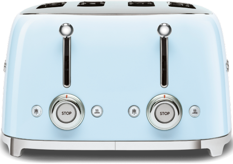 Этот изумительный нежно-голубой тостер мощностью 2100 Вт — один из лучших в своей ценовой категории. Модель выполнена в стиле 50-х годов, а потому отлично впишется в интерьеры ретро или прованс. В отличие от современных моделей, этот тостер не имеет дисплея и сенсоров, У него две пары рычагов и поворотных переключателей, каждая из которых обслуживает по два слота. Независимые панели — находка для тех, кто никак не может договориться о степени зажарки хлеба: можно одновременно использовать два из 6 уровней поджаривания. Ломтики центруются автоматически, что обеспечивает равномерное обжаривание каждого кусочка.