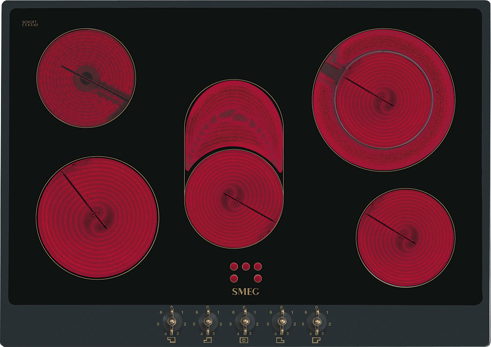 Одного взгляда на фотографию этой модели достаточно, чтобы заинтересоваться ее характеристиками. Характерной особенностью модели являются изящные поворотные переключатели из латуни – по одному для каждой конфорки. На рабочем столе из антрацитово-черной стеклокерамики Suprema шириной 72 см располагается целых 5 зон нагрева Hi-Light разного размера и формы. Самая мощная – задняя правая (2,4 кВт), у которой имеется зона расширения. Второе место делят центральная и передняя левая (по 2 кВт). Зона, расположенная посередине варочной панели, предназначена для овальной посуды и имеет соответствующее расширение. Оставшиеся две конфорки чуть менее мощные – по 1,2 кВт. Суммарная номинальная мощность – 8,6 кВт.