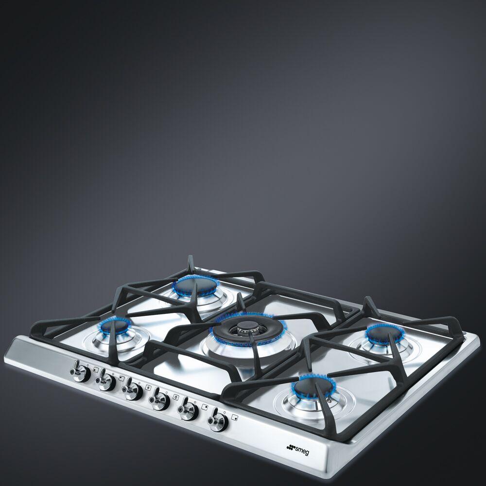 Газовая варочная поверхность с пятью зонами нагрева имеет стильный и практичный корпус из высококачественной нержавеющей стали. Такой материал очень универсален и практичен в уходе, не оставляет на себе следов от пальцев и устойчив к механическим повреждениям. Традиционный дизайн классической серии подразумевает наличие шести поворотных регуляторов, по одному на каждую конфорку и два – на центральную. Именно она обеспечивает наибольшую мощность нагрева, а также позволяет использовать посуду нестандартных размеров. Рациональное расположение конфорок гарантирует комфорт при одновременной готовке на всех зонах нагрева.