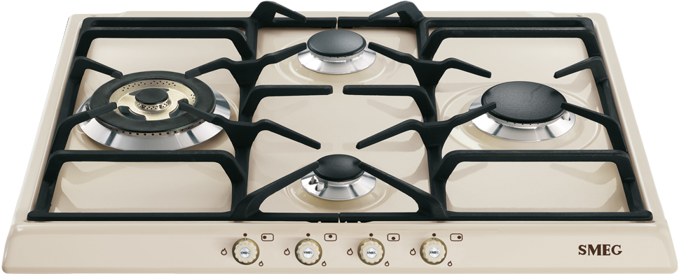 Эту модель нельзя не полюбить: кремовая эмаль, ромбовидное расположение четырех конфорок, классические габариты делают ее уместной практически в любой кухне. Кстати, у Smeg есть техника, выполненная в том же цвете, так что можно собрать комплект, включающий духовой шкаф и микроволновку. На варочной панели – четыре горелки, причем одна из них с несколькими ярусами пламени. У турбоконфорки с тройной короной – 3,3 кВт, а остальные имеют мощность 2,2 кВт, 1,65 и 1,05 кВт. Чтобы подчеркнуть высокое качество техники, компания Smeg использовала латунную фурнитуру.