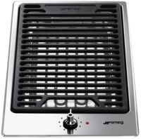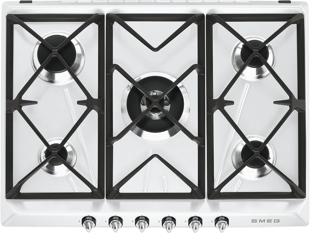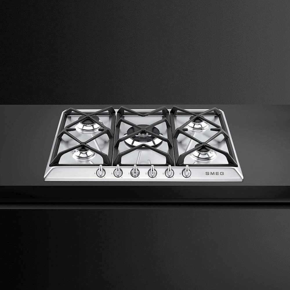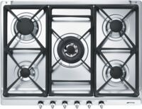Управление поверхностью осуществляется с помощью удобных поворотных переключателей. Автоматический электроподжиг и полный газ-контроль обеспечивают комфортную и безопасную эксплуатацию прибора. Рабочий стол оборудован 5 газовыми горелками, одна из которых (центральная) - ультрабыстрая конфорка с двойным управлением мощностью 5 кВт. На этой модели установлены новые горелки с вертикальным пламенем и эмалированными крышками. Практичная и элегантная газовая варочная панель от бренда SMEG отлично впишется в любой интерьер современной кухни.