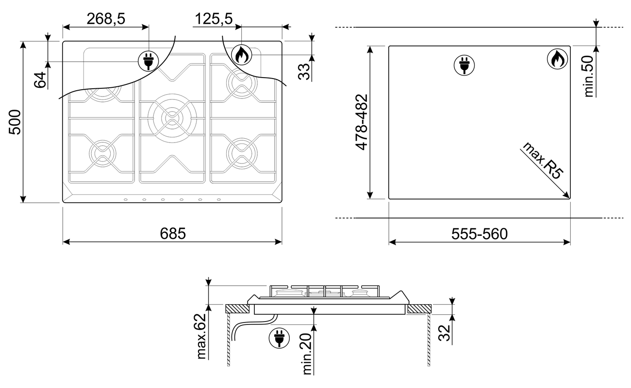 Газовая варочная панель шириной 68 и глубиной 50 см оснащена 5 конфорками разной мощности. Самая мощная горелка на 5 кВт имеет два ряда пламени (3,9 + 1,1 кВт) и располагается по центру. Справа (спереди и сзади) размещены очаги нагрева на 1,65 кВт, слева спереди – конфорка на 1,05 кВт, сзади – на 2,55 кВт. Такое сочетание рабочих зон позволяет гибко использовать технику для посуды разных размеров и экономить энергоноситель.