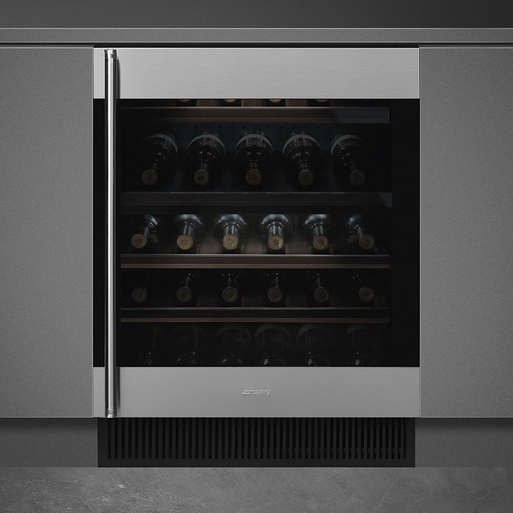 Специализированный холодильник из коллекции Classica разработан для долгосрочного хранения вина и охлаждения напитков перед подачей. Модель цвета нержавеющая сталь гармонично впишется в интерьер любой современной кухни. Винный шкаф SMEG предназначен для установки в мебельный гарнитур. Полезный объем рабочей камеры составляет 114 литров, она рассчитана на хранение 38 бутылок по 0,75 литра. Тонированное стекло Eclipse имеет защиту от ультрафиолетовых лучей. Эргономичные полки из натурального дерева надежно фиксируют бутылки в горизонтальном положении. Предусмотрена яркая и долговечная светодиодная подсветка.