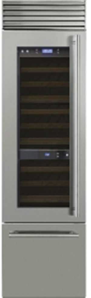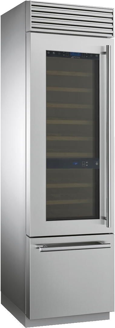 Отдельностоящий холодильник с общим полезным объемом 287 л предназначен для долгосрочного хранения вина в бутылках и других напитков. Винный шкаф цвета нержавеющей стали из серии Classica отличается изысканным дизайном (подробности можно прочесть в обзоре). Неперенавешиваемая дверца прибора (петли слева) с тонированным стеклом надежно защищает напитки от УФ-излучения. Главной особенностью модели является наличие холодильной и морозильной камер. Холодильное отделение (228 л) вмещает 54 бутылки по 0.75 л, которые размещаются горизонтально на выдвижных деревянных полках.