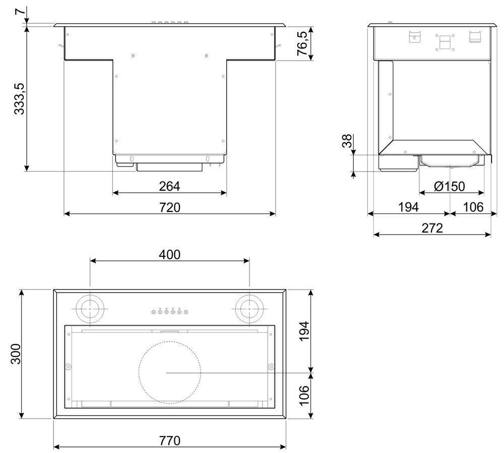 Не хотите тратить драгоценное место на кухне для установки вытяжного устройства? Вам подойдет вытяжка, встраиваемая в шкаф. Эта модель имеет ширину 77 см, поэтому прекрасно подойдет даже для варочных панелей на 5 конфорок. Нейтральный дизайн прибора (корпус и рабочая панель из нержавеющей стали) не нарушат гармонию интерьера – вытяжку можно установить в кухне, оформленной в любом стиле.