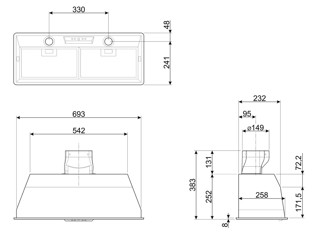 Эта модель итальянской сборки отличается высокой производительностью (691 м3/час) и элегантным дизайном. Встраиваемая вытяжка изготовлена из высококачественной нержавеющей стали, размеры устройства (ВxШxГ): 25.2x69.3x28.9 см, диаметр воздуховода для подключения вентиляции - 15 см. Предусмотрена установка в шкаф непосредственно над варочной панелью, есть яркая светодиодная подсветка рабочей зоны (2 LED-лампы по 2.5 Вт). Жироулавливающие фильтры из алюминия (2 шт) входят в комплектацию. Угольный фильтр доступен в качестве дополнительной опции (приобретается отдельно).